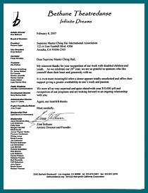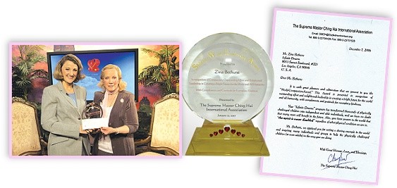 Her continuing efforts have been commended by the White House and recognized by Los Angeles Mayors Richard J. Riordan and Tom Bradley. She has received numerous awards, including the most recent Shining World Leadership Award by Supreme Master Ching Hai. For her noble work with the children, Supreme Master Ching Hai also made a contribution of US$10,000 to Bethune Theatredanse, which will be used for the scholarship program.