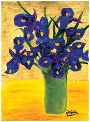 As I was reading a fairy tale entitled Iris by Hermann Hesse, the first few pages immediately reminded me of Master's Iris painting. The beautiful blue and purple flowers with the bright golden background that create a surreal radiant aura effect leave the observer memorized. The plump iris flowers are so alive and full of energy, as if they are about to burst into laughter and lead you to endless childish adventures. You feel as if the flowers are opening up to you in order to cheer you up, as well as fill your heart with childlike innocence and enthusiasm for life. This is exactly what the iris flower represents in Hermann Hesse's story: a symbol of childhood, "an open gate through which the soul, if it is ready, can enter into the inner part of the world, where you and I and day and night are all one." The story Iris is about a young boy who adored the Iris in his family's garden. Though there were many other flowers in the garden, the Iris was especially important to him, because "it became everything worth contemplating and everything that was miraculous." He often stared at the Iris and drifted off into a dreamlike state, where he could feel the oneness of the universe and the blissfulness of life. However, when the boy grew up, he became a man deeply engaged in the outer world; thus he completely forgot about what the Iris symbolized. Later he became a famous scholar, a professor who was respected by many, but in his heart, he was unhappy and discontented. This feeling began to dispel as his attraction grew towards a special girl named Iris. Her name reminded him of something deep, distant and important; but he could not pinpoint what exactly he was feeling. He eventually asked Iris to marry him, but Iris turned down his proposal, stating, "I can live without flowers and also without music ... however, there's one thing which I can't and won't do without: I can never live, not even just for a day, if the music in my heart is not at the core of everything I do." Iris demanded that he find his inner self before she would accept his proposal. With reluctance, the man agreed and embarked on an inner journey of self-discovery. Some years passed and the man developed a new sensitivity to life and became tender. But before he completed the mission, Iris became ill and was dying. Before she died, she gave him an iris and told him, "Search for me ... search for the iris. Then you'll come to me." He continued searching. Eventually, the man rediscovered his childhood dream and became fully alive again through the Iris. "He began to sing softly, and his path sloped gently towards home." I wonder if this is one of the reasons