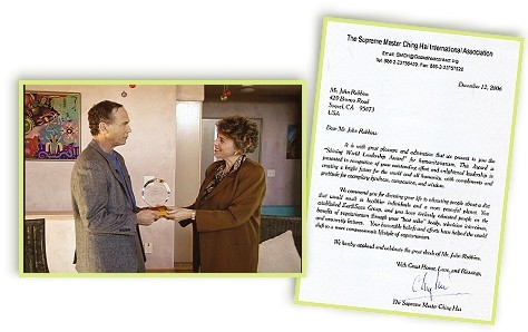 I: Yeah, that's interesting. I also wanted to congratulate you on the "Shining World Leadership Award" for humanitarianism from Supreme Master Ching Hai. She was very excited and impressed with the nobility you demonstrated in walking away from what could've been a very wealthy lifestyle, in the name of your values and your choices. J: Well I did it in the name of all of our aspirations for a humane and sustainable world. It wasn't just for me. It really was for the planet, for all of us who are striving and inspiring towards creating a spiritually fulfilling, socially just and environmentally sustainable human presence on this planet. I: Thank you so much for your work because I've read that for a couple of years after "A Diet for a New America" came out, beef sales in the US dropped almost 20% and there's been Howard Lyman and a number of other activists that have brought out the terrors of what has gone on in the beef industry. So I think it's interesting to see the ripple effect 20 years later. J: And I mean you can translate that 20 % reduction of beef consumption into how many fewer heart attacks occurred, how many fewer cases of cancer occurred, how much less diabetes there was. Not that these epidemics aren't still major issues, but they have been to a degree ameliorated by that reduction. You can also translate it into how many square miles of tropical rainforests are still standing that would otherwise would have been destroyed? How many species are still with us that would otherwise have been extinguished? How much less water pollution we have to deal with, how much less greenhouse gases are in our atmosphere as a result of that reduction? We're still trashing the environment, but this was a big step; and I will feel fulfilled only when it is a step that many other people take, and we continue on that path, because the day that slaughter houses are a memory, the day that world hunger is a memory, the day that environmental destruction is a memory, will be the day that I rejoice. I: I agree with you. The members in our Association all over the world have been doing a campaign on Alternative Living, trying to bring the word to people to associate compassion with our diet choices. J: People today are very removed from animals and if they have images, they are of family farms and animals running around on the farm. Modern meat production has become something totally institutionalized and utterly dominated by the profit motive and a true violation of the human heart's need to live in integrity with the well-being of other forms of life. I: So one last question to you on that note is in terms of your own spiritual motivation in life. We all meditate in our Association but a lot of people have different forms of practice. What is your secret to success in spiritual harmony?