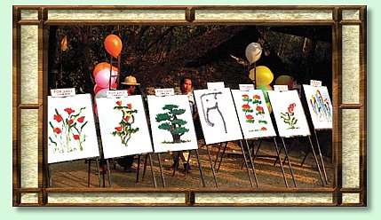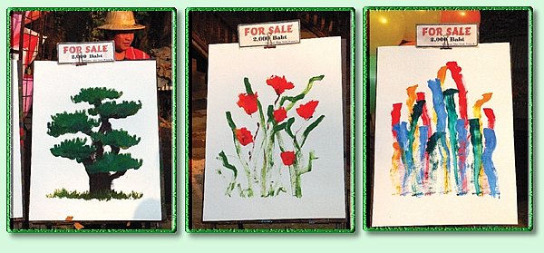 | Obras de los elefantes. Al centro, la imagen de un elefante pintada por otro elefante. |
