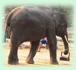 Al terminar su creación artística, este elefante artista se retira tranquilamente, llevando su equipo de pintura. |