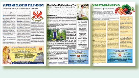 [Zilina] El Centro de Zilina en Eslovaquia, ha publicado anuncios de Supreme Master Television en varios periódicos y revistas durante los últimos meses. En junio, julio y agosto del Año Dorado 4 (2007), tres artículos de una página completa fueron publicados, cortesía de The Traveler (una revista ampliamente leída para viajeros), en combinación con anuncios de Supreme Master Television en la revista. Anuncios similares fueron colocados en la revista Eurotelevision, (sobre programas de televisión) y el periódico New Time Saturday, (que tiene la mayor circulación en Eslovaquia). Como somos una organización no-lucrativa, nos dieron descuentos especiales. Muchas gracias para The Traveler, por publicar artículos y los anuncios de Supreme Master Television durante los últimos meses. El primero de los tres artículos, describe los beneficios del vegetarianismo y hace énfasis en famosos vegetarianos del pasado y del presente. El segundo artículo, da una pequeña explicación sobre el Método de Meditación Quan Yin y de la Maestra Suprema Ching Hai. El tercero describe programas interesantes y otra información básica de Supreme Master Television.